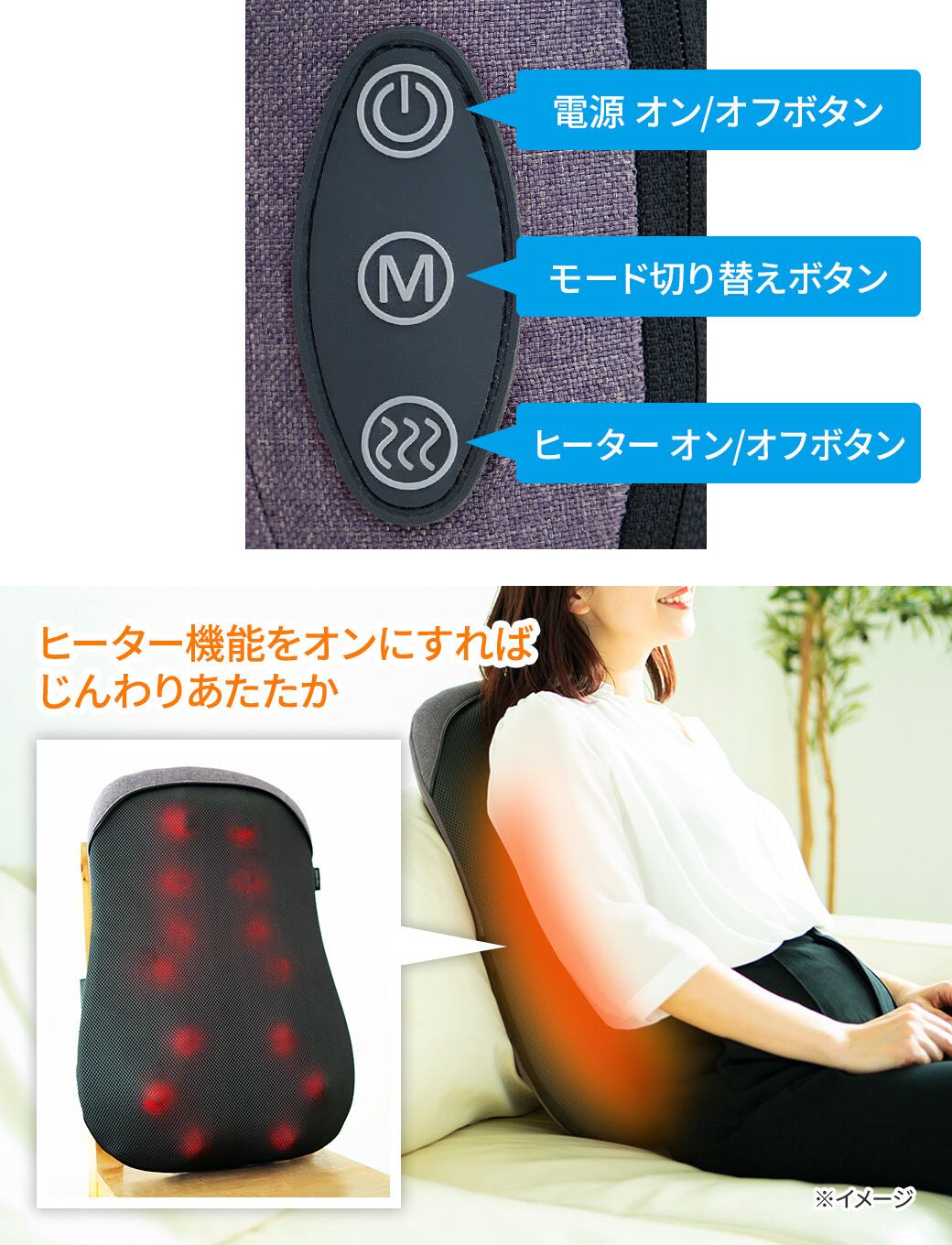 上下、左右の動きに加えて前後にも動くため、より体の曲線に沿った立体的なマッサージが可能に。突出量を増やしたもみ玉は深部のコリを捉えてほぐしてくれます。また、ヒーター機能をオンにすれば、じんわりとした温かさが伝わり、リラックスした状態で心地良くマッサージを味わうことができます。