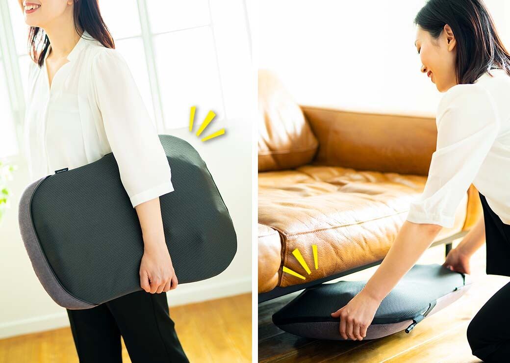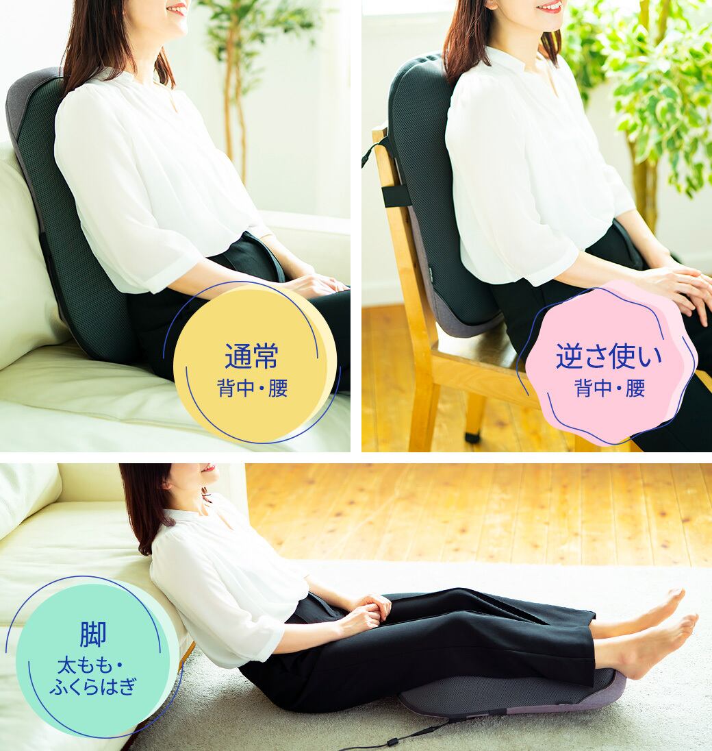 椅子やソファ、または壁に立て掛けて腰や背中をマッサージすることはもちろん、床に置いて太ももやふくらはぎを乗せて足のマッサージをすることもできます。