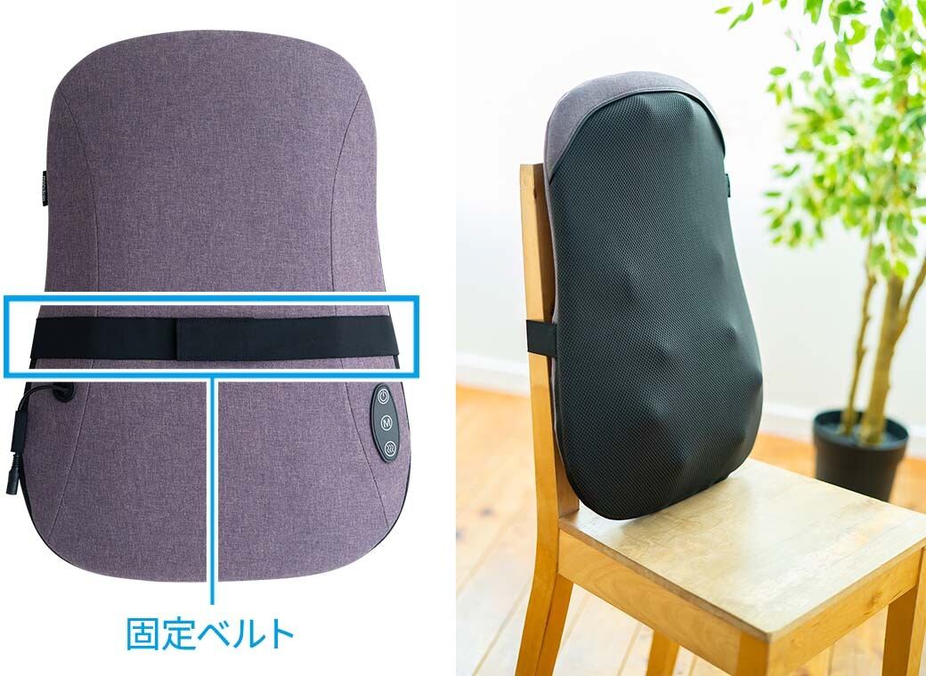 本体背面に伸縮性のあるゴム製の固定ベルトが付いたことによって、椅子や座椅子等の背もたれに固定して使用することができます。ずれにくく、安定してお使いいただけます。