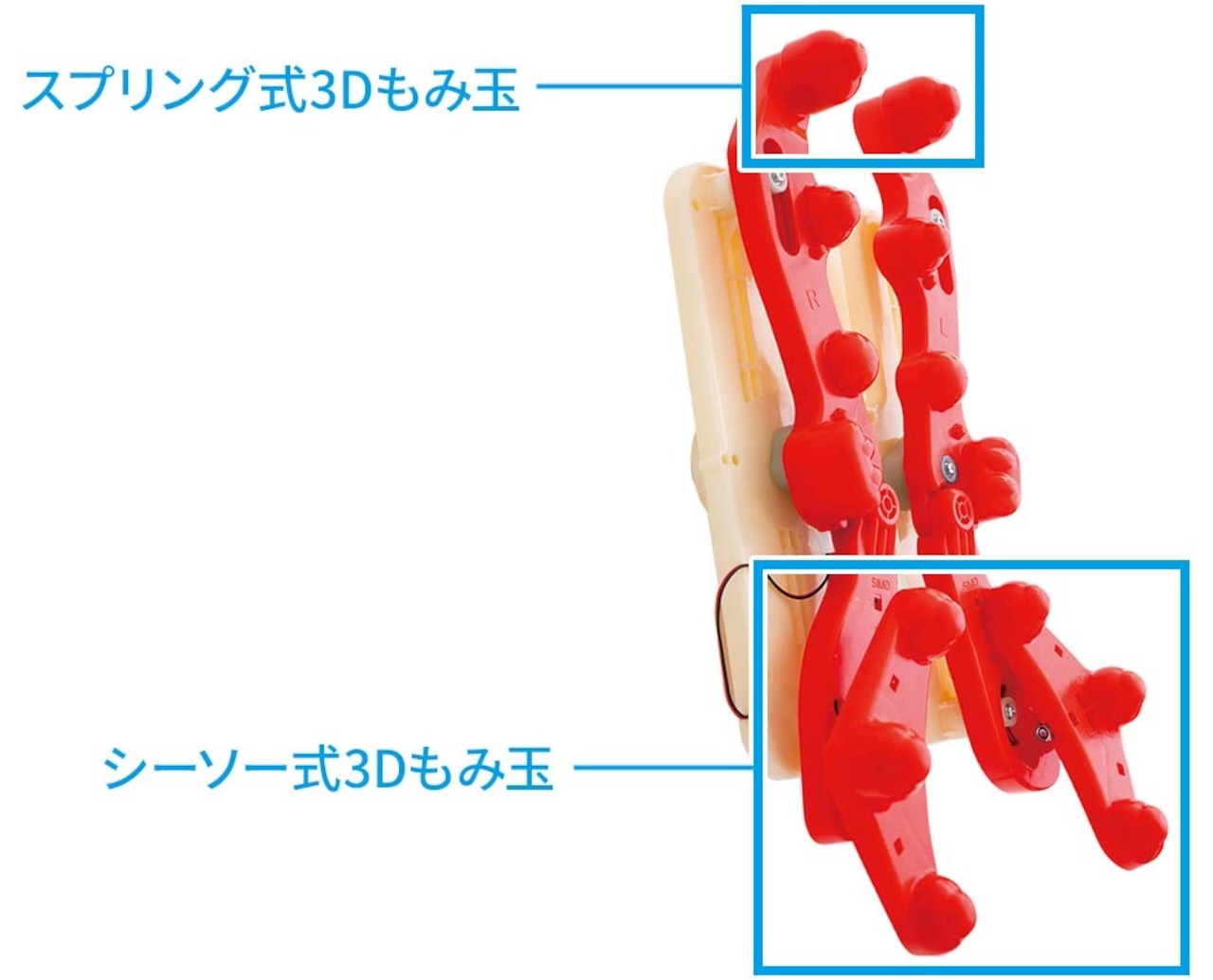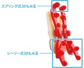 14個あるもみ玉のうち、独立したシーソー式の3つのもみ玉は下部の左右に1つずつあり、スプリング式のもみ玉は最上部に1つずつあります。計8個の3Dもみ玉が上下、左右、前後に動いて深いコリにアプローチ。立体的にもみほぐします。